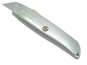 The Stanley original retractable blade knife is made from grey painted die-cast metal body, which is ergonomically shaped for a good, comfortable grip. The blade extension can be controlled by the blade shifter, and 5 blade positions allows a wider usage for a variety of cutting applications. The interlock nose firmly secures the blade into knife. For safety, the blade can be fully retracted into the body.